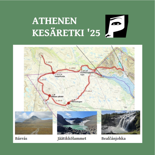 Aalto-yliopiston informaatioverkostojen ja teknillisen psykologian killan Athenen viikon mittainen kesäretki suuntautui heinäkuun alussa kolmen valtakunnan maisemiin. Reissumme alkoi reippaalla Mallan luonnonpuiston ylityksellä (11km), jonka jälkeen etenimme ympyräreittiä pitkin: Kuohkimajärven tupa – Gappohytta (16km) – Pältsatunturin laakso (12km) – Pältsastugan (8km) – Koltalahti (15km). Päiväretkillä kohtasimme mm. jylhän Bárrástunturin huipun, turkoosina hohtavat jäätikkölammet ja kuohuvan Bealčánjoen vesiputoukset. Viimeisen vaelluspäivämme kruunasi paluu Kilpisjärvelle Mallalaivan kyydissä.